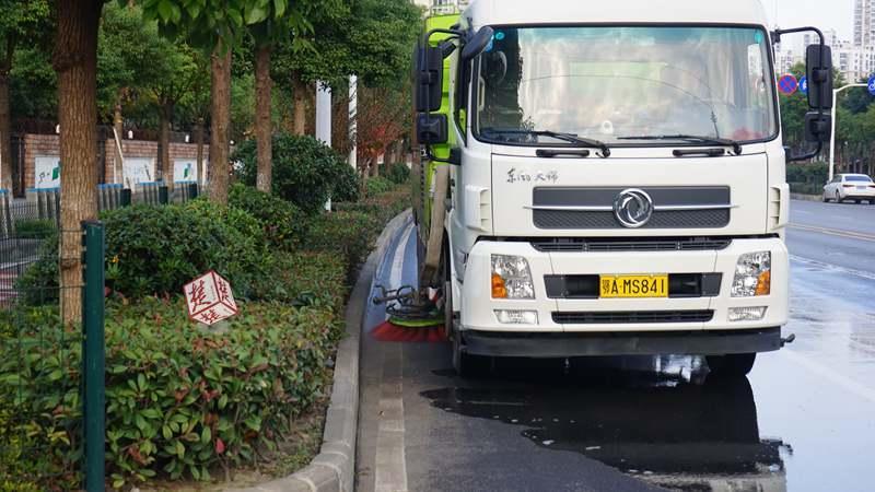 對(duì)未沖洗到的一米范圍內(nèi)道路區(qū)域,再安排吸掃車(chē)帶水清洗。灑水車(chē)沖洗,吸掃車(chē)收邊,比從前的清洗方式要高效得多,也避免出現(xiàn)揚(yáng)塵反彈。